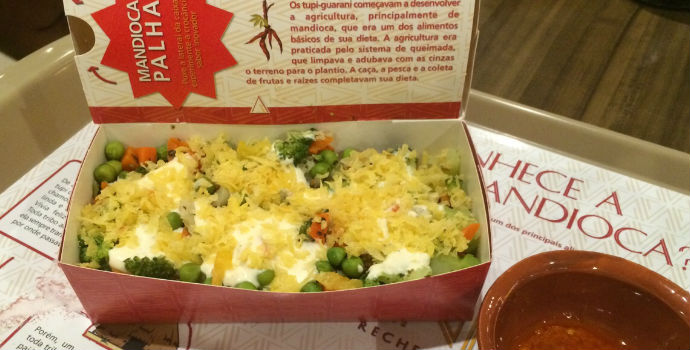 Comi o Nhará, que vai cenoura, vagem, ervilha, brócolis, couve-flor, molho branco e mandioca palha na cobertura (R$ 17).